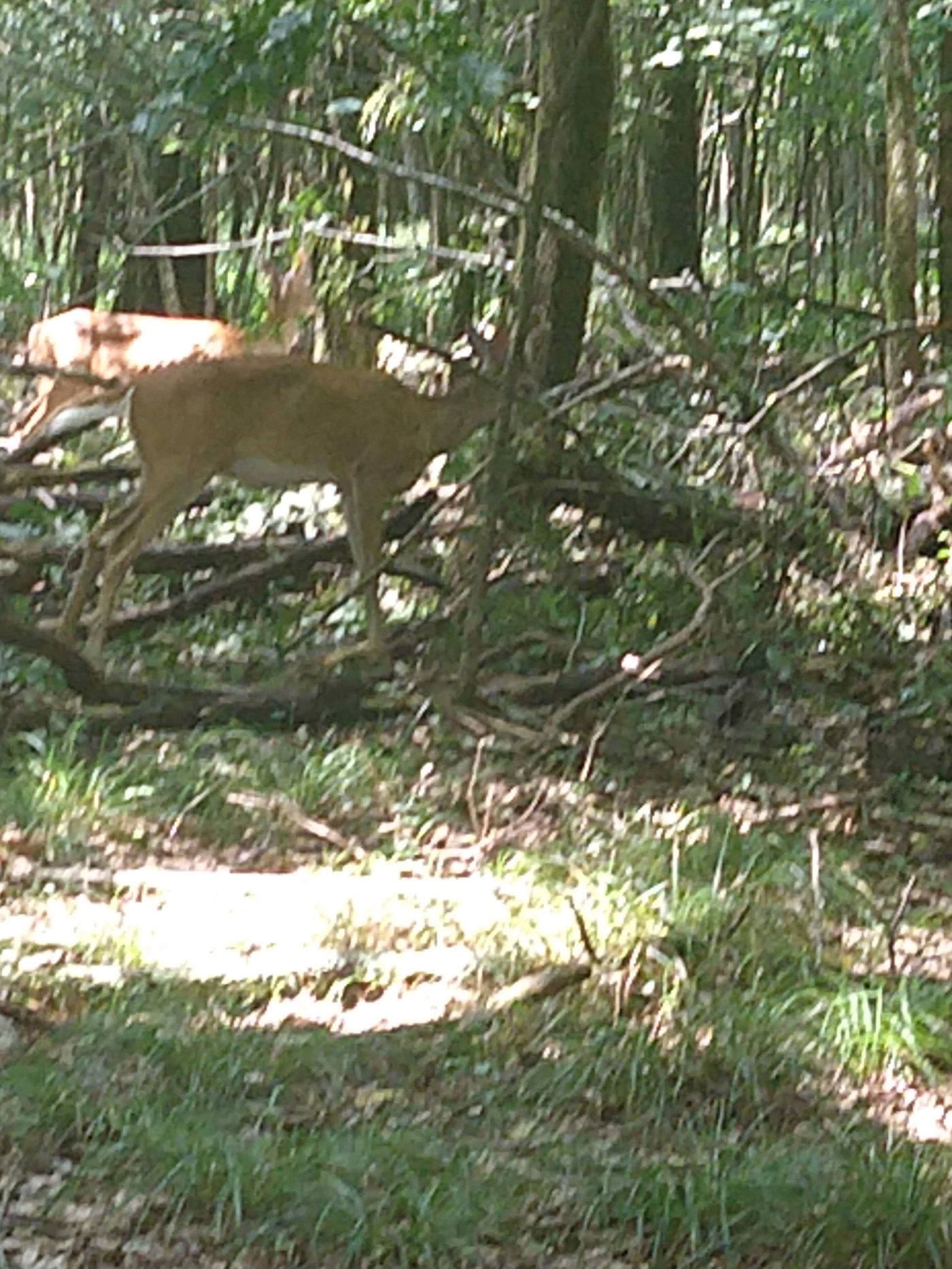 We rounded a bend in the trail, and there was a family of deer eating leaves. As we approached, they just kept enjoying the meal nature was providing for it. Even when we took pictures, they stayed there, unafraid of us. I marveled at the fact that the deer and I are connected through our Creator, different in form and purpose, but, nevertheless, both valuable to the steady forward beat of the universe.
