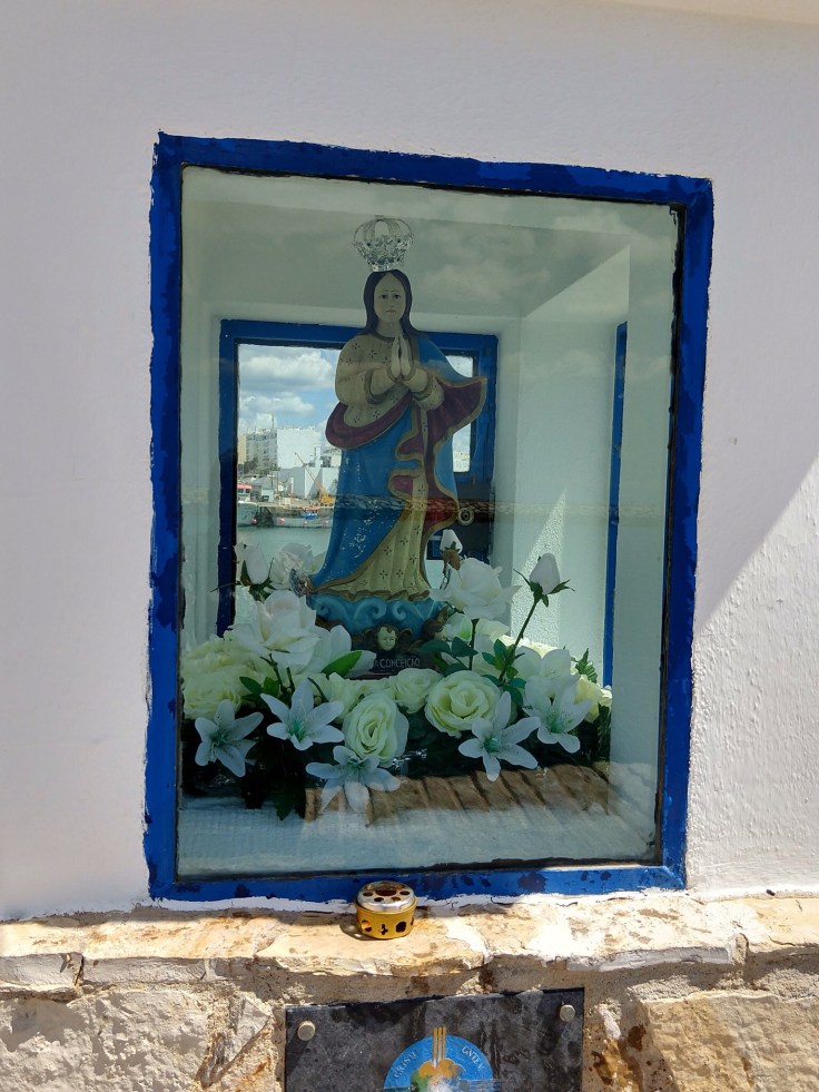 I saw this window with an unexpected statue of what I think is a saint that watches over the ships and boats in Quarteria, Portugal. It was at the end of a long pier at the harbor. We were there to watch fishing boats come and go. I guess when you spend a lot of time on water, you need to believe that someone is watching over you and protecting you, increasing the odds that you return to port safely. The beauty of the city and water behind her was wonderful to see.
