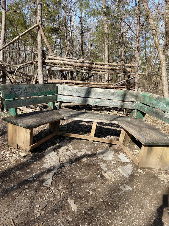 I saw this triple-seat in the woods one day, and I thought of all the people who could sit here together and talk. It looked just right for a meeting of the minds.