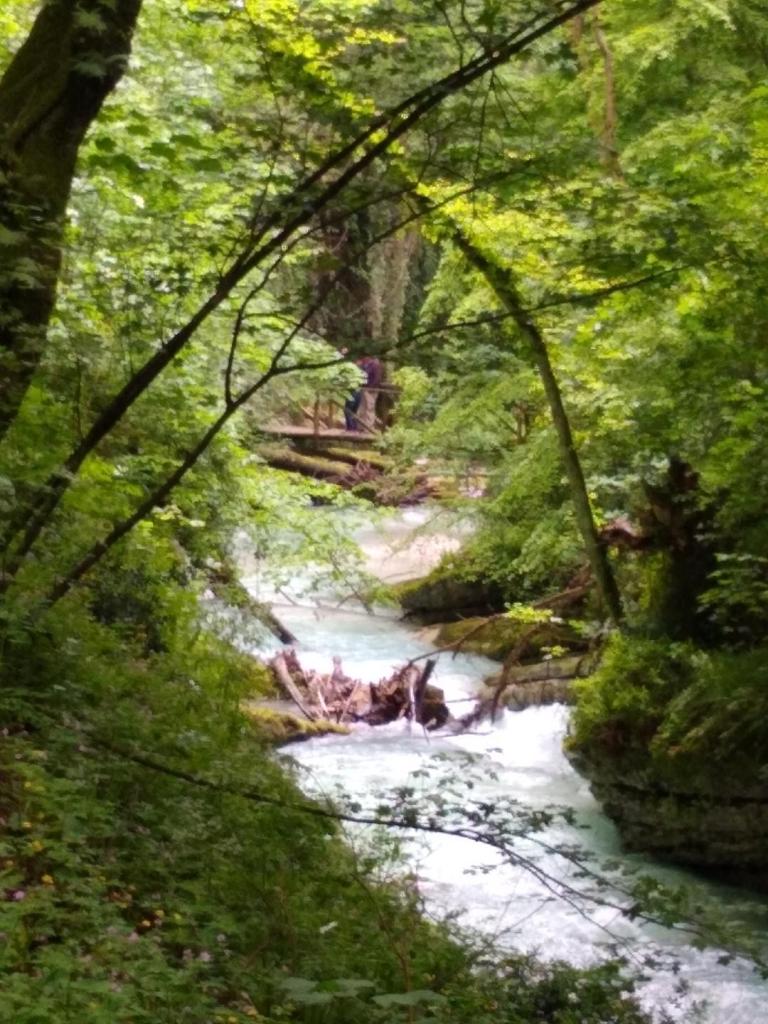While I rest a lot, Douglas is having a grand old time, walking and hiking all over the place. He spent a day hiking in a gorge about an hour’s drive away. I let him have what we call “Dougie Days,” where he goes off to do things I don’t have the courage to do or is too smart to do. I don’t want the defibrillator going off in Italy! These pictures give you an idea of how dangerous the hike was.