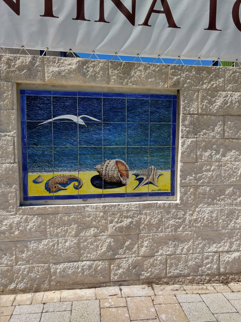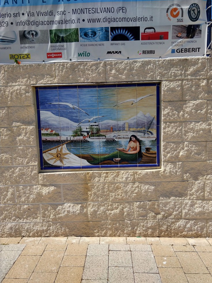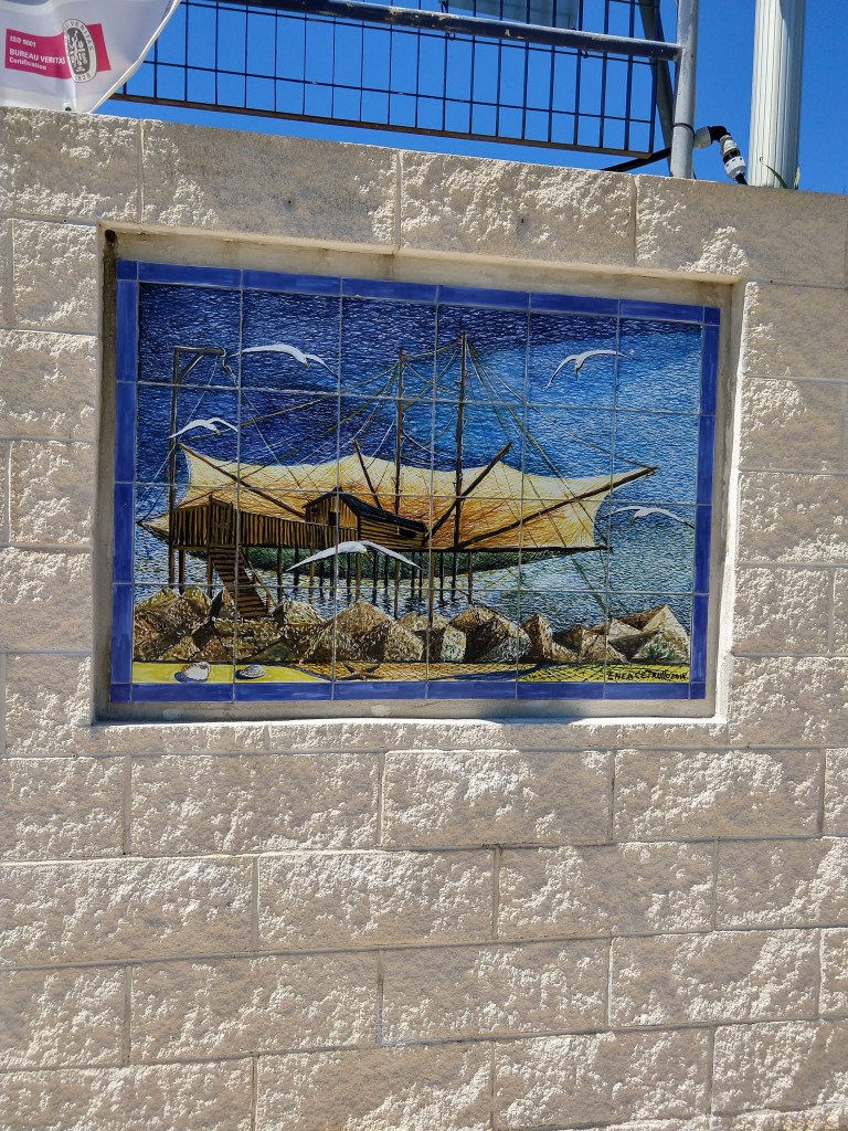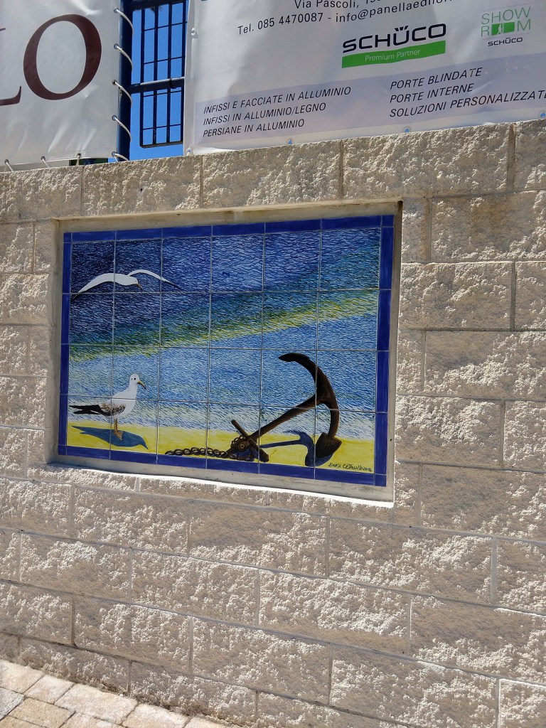 The Pescara Marina was beautiful to see, with blues so deep and pictures of sea creatures every where. I was enthralled by the art. Art, boats, blue waters, blustery winds, no fog, and Douglas by my side is a recipe for fun. After all, the sea has been the salvation of Italians for more than three millennia!