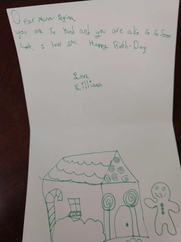 So, I wasn’t prepared for the lovely cards I received from the grandchildren who call me Nana Regina. The one that nearly caused my heart to stop was from the only girl, and it reads:Dear Nana Regina, You are so kind and you are so so sooo sweet. I love you. Happy Birth-Day.”